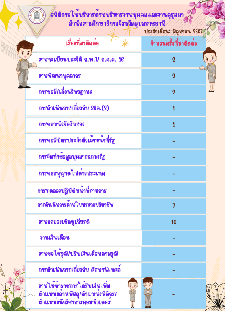 สถิติการให้บริการด้านบริหารงานบุคคลและงานคุรุสภา ประจำเดือนมิถุนายน 2567 กลุ่มบริหารงานบุคคล 04/07/2024 บริหารงานบุคคล Leave a comment 446 Views Share Facebook Twitter Google + Stumbleupon LinkedIn Pinterest 2024-07-04 กลุ่มบริหารงานบุคคล Share Facebook Twitter Google + Stumbleupon LinkedIn Pinterest