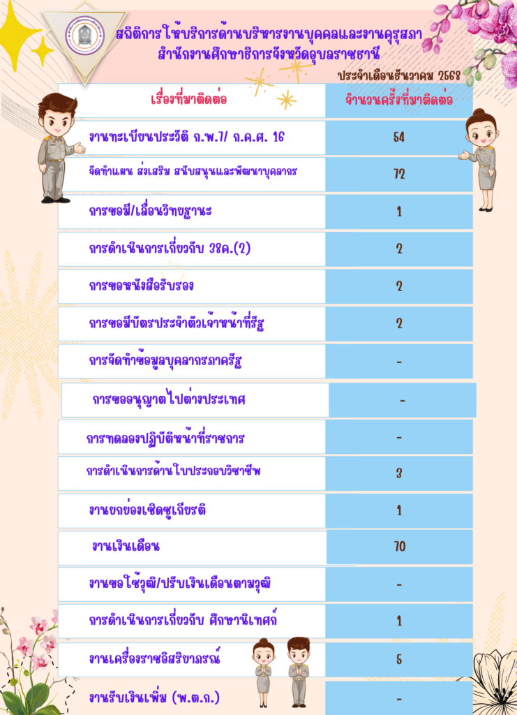 สถิติการให้บริการด้านบริหารงานบุคคลและงานคุรุสภา ประจำเดือนธันวาคม 2568 กลุ่มบริหารงานบุคคล 2 สัปดาห์ ago บริหารงานบุคคล Leave a comment 47 Views Share Facebook Twitter Google + Stumbleupon LinkedIn Pinterest 2026-01-07 กลุ่มบริหารงานบุคคล Share Facebook Twitter Google + Stumbleupon LinkedIn Pinterest