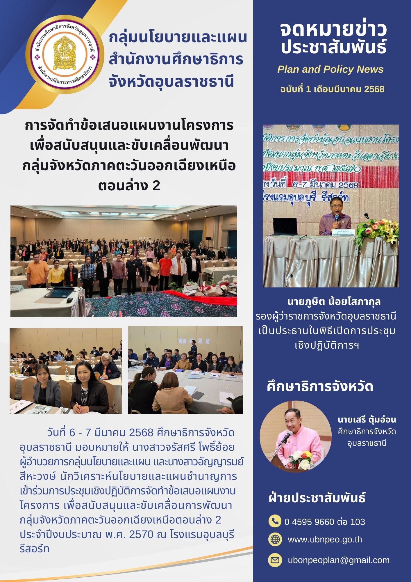 สนง.ศธจ.อบ. ร่วมจัดทำข้อเสนอแผนงาน โครงการ เพื่อสนับสนุนและขับเคลื่อนการพัฒนากลุ่มจังหวัดภาคตะวันออกเฉียงเหนือตอนล่าง 2 ประจำปีงบประมาณ พ.ศ. 2570 Co-Admin 07/03/2025 ข่าวและภาพกิจกรรม, นโยบายและแผน Leave a comment 179 Views Share Facebook Twitter Google + Stumbleupon LinkedIn Pinterest 2025-03-07 Co-Admin Share Facebook Twitter Google + Stumbleupon LinkedIn Pinterest